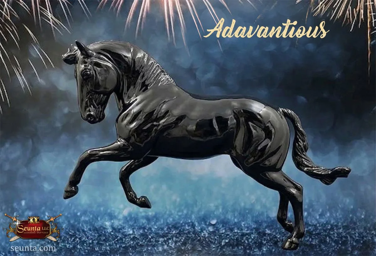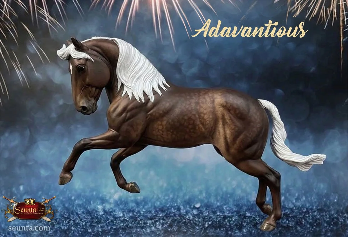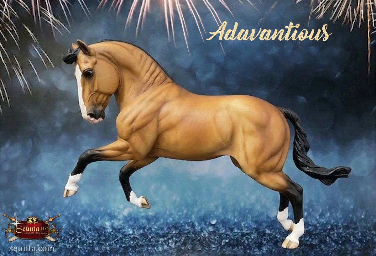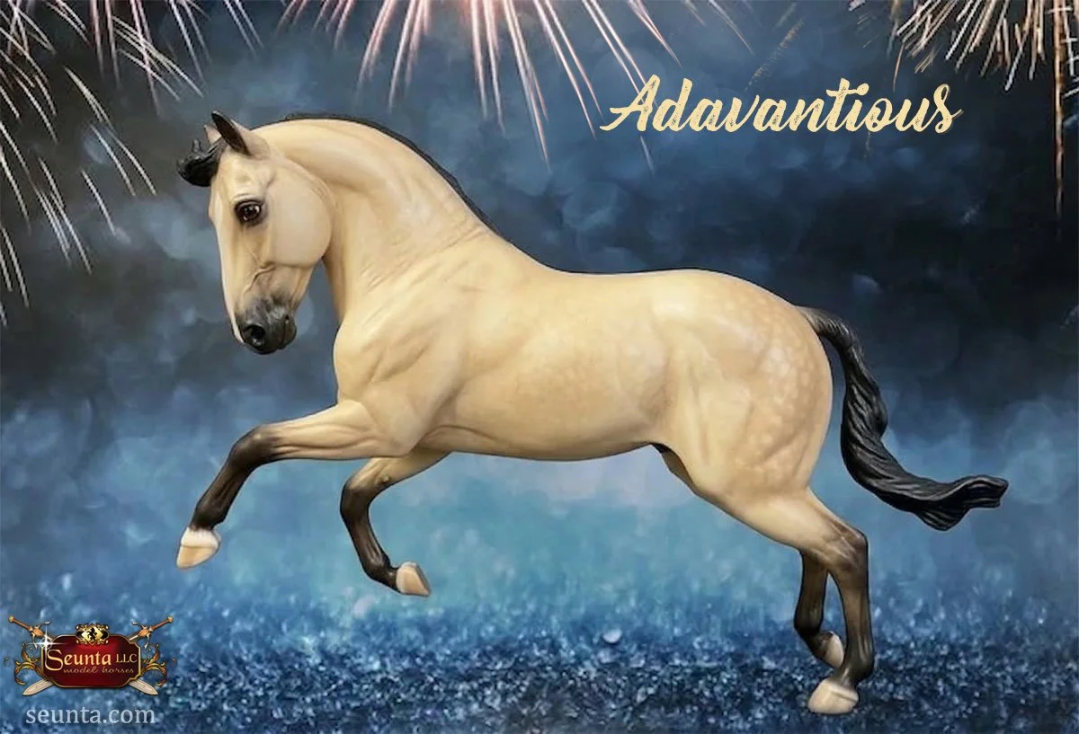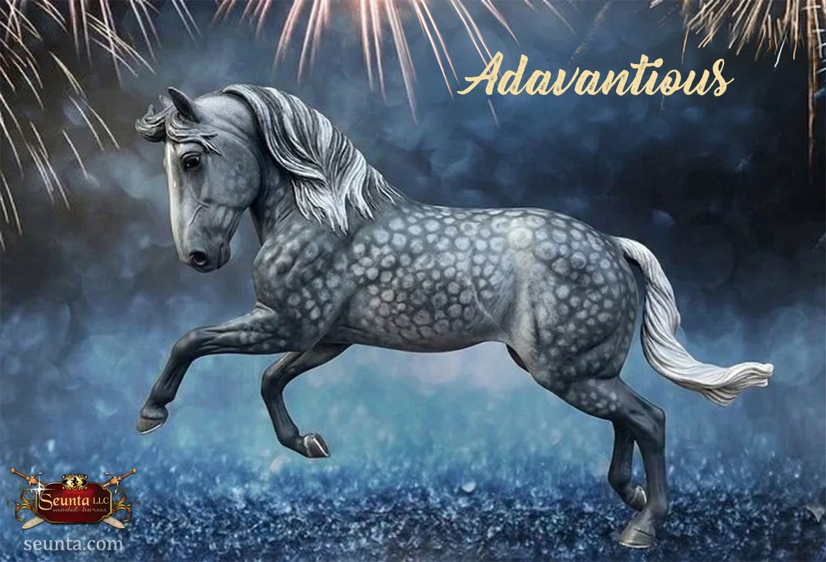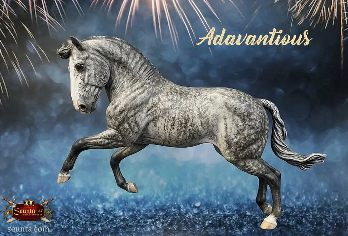 The head of Adavantious is sculpted with a distinct convex profile and noble features. The eyes are expressive, capturing the calm intelligence and alertness of the Andalusian. His overall expression projects an attentive and proud look.
